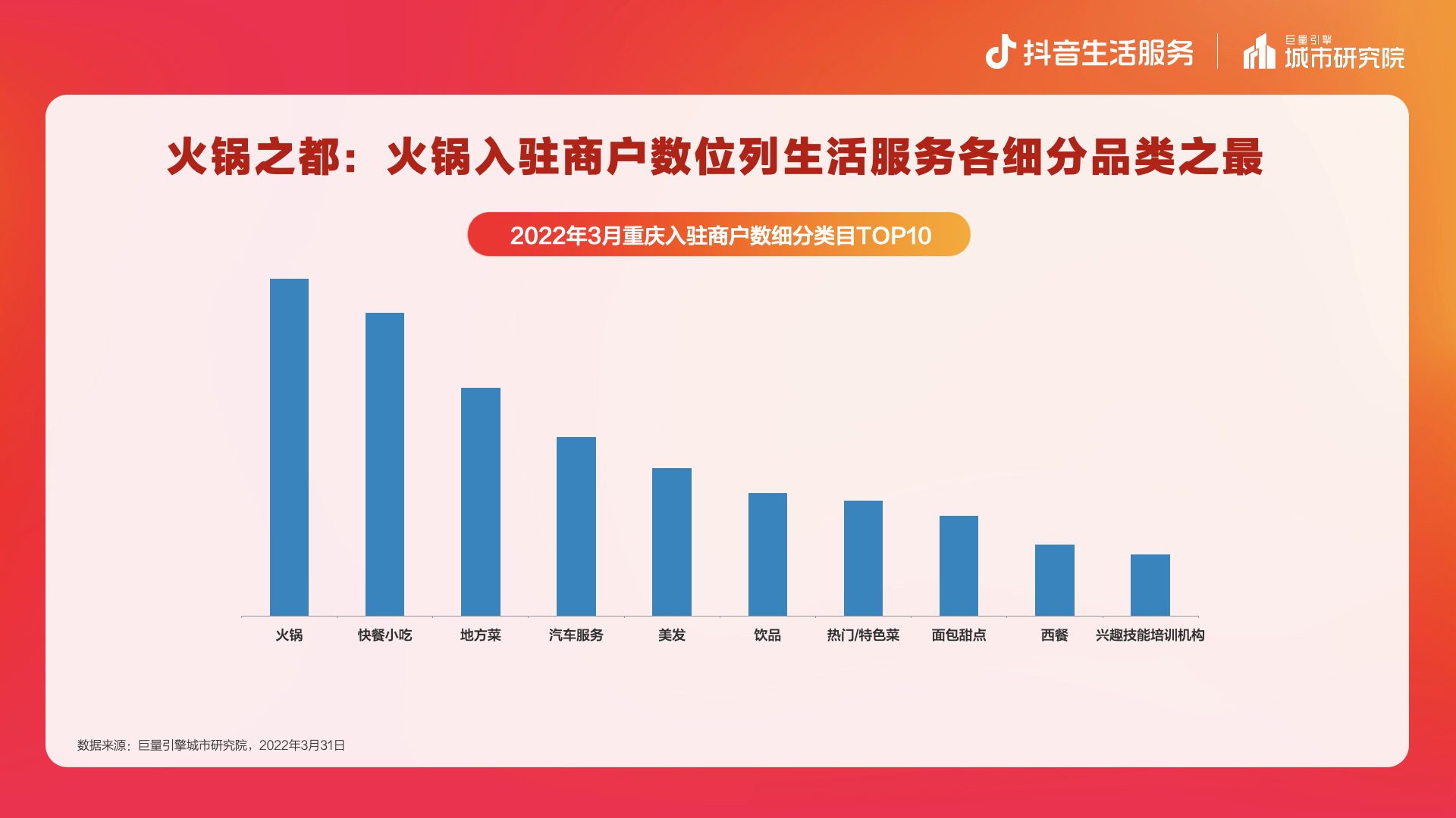 “心动重庆”活动期间,巨量引擎城市研究院发布《数探重庆美好生活》数据报告,通过抖音数据探寻重庆:在抖音,重庆“火锅”品类商户占比最高,是当之无愧的“火锅之城”, 老排档与新品牌呈现“江湖论菜”之势,除了舌尖故事,也是游客热爱的打卡目的地,老山城和新重庆皆具魅力。
