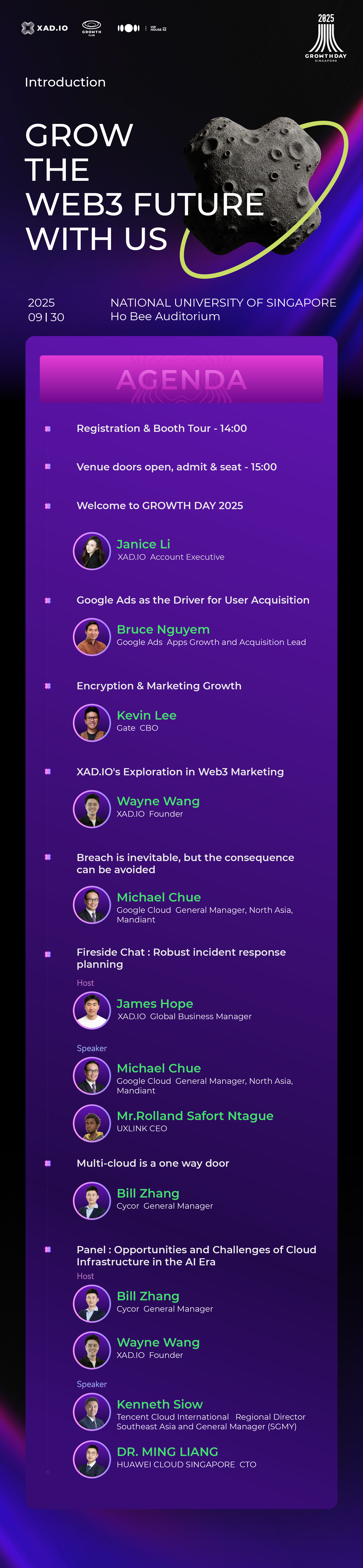 由国际化智能营销服务企业 XAD.IO 主办的首届 GROWTHDAY Singapore 2025,将于2025年9月30日在新加坡国立大学 Ho Bee Auditorium 隆重举行。本届大会以“GROW THE WEB3 FUTURE WITH US”为主题,聚焦Web2向Web3的扩圈之道,旨在为来自全球的1700余名Web3从业者、投资者与技术决策者提供一场从策略到落地的深度增长体验。